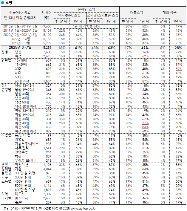¡Ý TVȨ¼îÇÎ ¿¬°£ ÀÌ¿ë·üÀº 2019·2020³â 52%¿¡¼ 2022³â 40%·Î Ç϶ôÇß´Ù°¡ 2025³â 49%·Î Àç»ó½ÂÇß´Ù. ¿©ÀüÈ÷ ¿¹Àü¸¸ ¸øÇÏÁö¸¸, µ¶ÀÚÀû »óǰ ±âȹ°ú ¿µ»ó ÄÜÅÙÃ÷ÀÇ °Á¡À» ¸ð¹ÙÀÏ ¶óÀ̺ê Ä¿¸Ó½º¿Í °áÇÕÇÏ´Â µî Ȱ·Î¸¦ ¸ð»ö ÁßÀÌ´Ù. ³²¼º(¿¬°£ 36%)º¸´Ù ¿©¼º(62%), ƯÈ÷ 40·50´ë ¿©¼º(80% ³»¿Ü)ÀÌ ÁÖ °í°´Àε¥ À̵éÀº ¸ð¹ÙÀÏ ¼îÇεµ Áñ±ä´Ù.