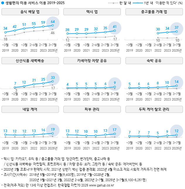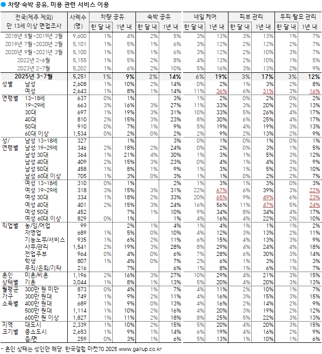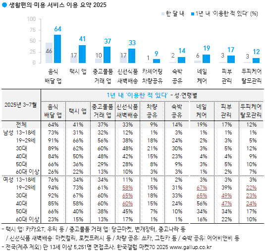 ¡Ý ±× ¿Ü Åýà ¾Û ¿¬°£ ÀÌ¿ë·üÀº 41%, ¼÷¹Ú °øÀ¯ 14%, Ä«¼Î¾î¸µ·Â÷·® °øÀ¯ 9%, ³×ÀÏ Äɾî 19%, ÇǺΠ°ü¸® 17%, µÎÇÇ·Å»¸ð °ü¸® 12%´Ù. Â÷·® °øÀ¯, ¼÷¹Ú °øÀ¯´Â 20~40´ë Áß½ÉÀ¸·Î Á¡Áõ, ¿©¼º ±âÁØ ³×ÀÏ Äɾî(2019³â 24% → 2025³â 36%)¿Í ÇǺΠ°ü¸®(23%→31%), ³²³à µÎÇÇ·Å»¸ð °ü¸®(³²¼º 4%→8%; ¿©¼º 10%→16%) µî »ýȰÆíÀÇ·¹Ì¿ë ¼ºñ½º ´ëºÎºÐ ÆÒµ¥¹Í ÀÌÀü ¼öÁØÀ» ³Ñ¾î¼¹´Ù.