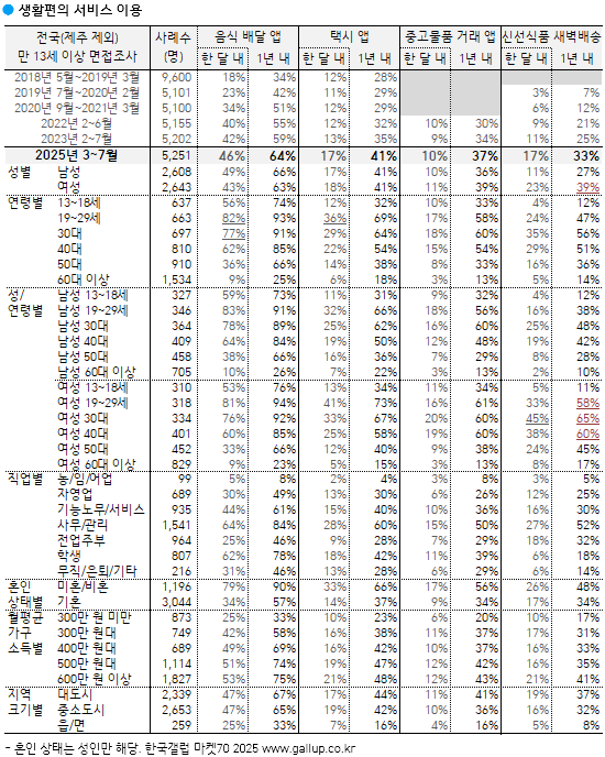 ÁÖ¿ä »ýȰÆíÀÇ ¼ºñ½º¿¡¼´Â À½½Ä ¹è´Þ ¾Û ¿¬°£ ÀÌ¿ë·üÀÌ 2020³â Äڷγª19 ÆÒµ¥¹Í Á÷Àü 42%¿¡¼ 2025³â 64%±îÁö ´Ã¾ú´Ù. 20·30´ëÀÇ À½½Ä ¹è´Þ ¾Û ¿¬°£ ÀÌ¿ë·üÀº 90%¸¦ ¿ôµ¹°í, ¿ù°£ ÀÌ¿ë·üµµ 80% ¾ÈÆÆÀÌ´Ù. 13~18¼¼ û¼Ò³â Áß¿¡¼µµ 1³â ³» 74%, ÃÖ±Ù ÇÑ ´Þ ³» 56%°¡ ÀÌ¿ëÇÑ Àû ÀÖ´Ù°í ´äÇØ ¸í½Ç»óºÎÇÑ »ýȰ Çʼö ¼ºñ½º¶ó°í º¼ ¸¸ÇÏ´Ù.