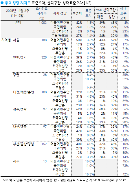 2025³â 11¿ù µÑ° ÁÖ(11~13ÀÏ) ÇöÀç ÁöÁöÇÏ´Â Á¤´çÀº(´ç¸í ·ÎÅ×À̼Ç, ÀçÁú¹® 1ȸ) ´õºÒ¾î¹ÎÁÖ´ç 42%, ±¹¹ÎÀÇÈû 24%, °³Çõ½Å´ç 3%, Á¶±¹Çõ½Å´ç 2%, Áøº¸´ç 1%, ÁöÁöÇÏ´Â Á¤´ç ¾ø´Â ¹«´ç(ÙíÓÚ)Ãþ 27%´Ù. 8¿ù Áß¼ø ÀÌÈÄ ¿©´ç ÁöÁöµµ 40% ³»¿Ü, ±¹¹ÎÀÇÈû 20%´ë Áß¹Ý ±¸µµ°¡ À̾îÁö°í ÀÖ´Ù.