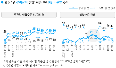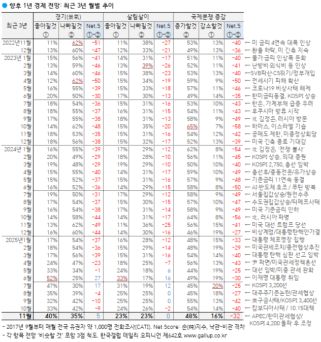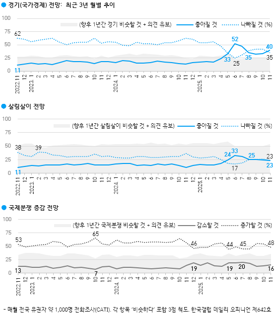 Çѱ¹°¶·´ÀÌ 2025³â 11¿ù 18~20ÀÏ Àü±¹ ¸¸ 18¼¼ ÀÌ»ó 1,000¸í¿¡°Ô ÇâÈÄ 1³â°£ ¿ì¸®³ª¶ó °æ±â Àü¸ÁÀ» ¹°Àº °á°ú 40%°¡ 'ÁÁ¾ÆÁú °Í'À̶ó°í ³»´ÙºÃ°í, 35%´Â '³ªºüÁú °Í', 22%´Â 'ºñ½ÁÇÒ °Í'À̶ó°í ´äÇß´Ù. 3%´Â ÀǰßÀ» À¯º¸Çß´Ù. ³«°ü·ÐÀÌ Àü¿ù ´ëºñ 7%Æ÷ÀÎÆ® ´Ã°í, ºñ°ü·ÐÀº ±×¸¸Å ÁÙ¾î 4°³¿ù ¸¸¿¡ ´Ù½Ã °æ±â ³«°ü·Ð¿¡ ÈûÀÌ ½Ç·È´Ù. ÀÌ´Â ÇÑ¹Ì °ü¼¼Çù»ó Àϴܶô, ÄÚ½ºÇÇ(KOSPI, Á¾ÇÕÁÖ°¡Áö¼ö) 4,000¼± µ¹ÆÄ¿¡ ÈûÀÔÀº °ÍÀ¸·Î º¸ÀδÙ. °æ±â ³«°ü·ÐÀº Çö Á¤ºÎ Ãâ¹ü Á÷ÈÄÀÎ ¿ÃÇØ 6¿ù 52%·Î 8³â ³» ÃÖ°íÄ¡, ºñ°ü·Ð 25%·Î ÃÖÀúÄ¡¸¦ ±â·ÏÇÑ ¹Ù ÀÖ´Ù.