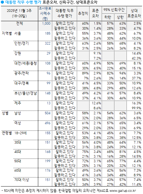 Çѱ¹°¶·´ÀÌ 2025³â 11¿ù ¼Â° ÁÖ(18~20ÀÏ) Àü±¹ ¸¸ 18¼¼ ÀÌ»ó À¯±ÇÀÚ 1,000¸í¿¡°Ô ÀÌÀç¸í ´ëÅë·ÉÀÌ ÇöÀç ´ëÅë·ÉÀ¸·Î¼ÀÇ Á÷¹«¸¦ Àß ¼öÇàÇϰí ÀÖ´Ù°í º¸´ÂÁö À߸ø ¼öÇàÇϰí ÀÖ´Ù°í º¸´ÂÁö ¹°Àº °á°ú(2Á¡ ôµµ, ÀçÁú¹® 1ȸ), 60%°¡ ±àÁ¤ Æò°¡Çß°í 30%´Â ºÎÁ¤ Æò°¡Çß´Ù. 10%´Â ÀǰßÀ» À¯º¸Çß´Ù.