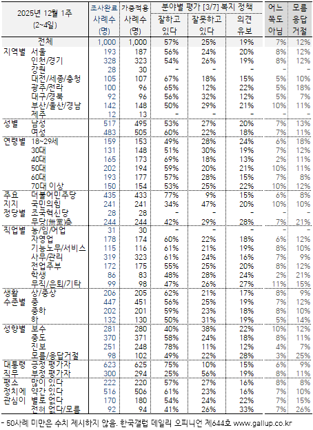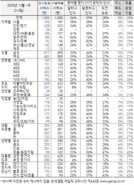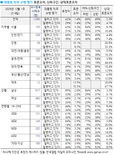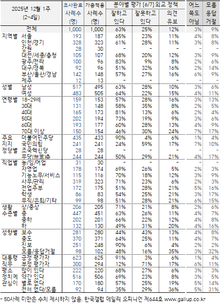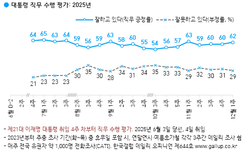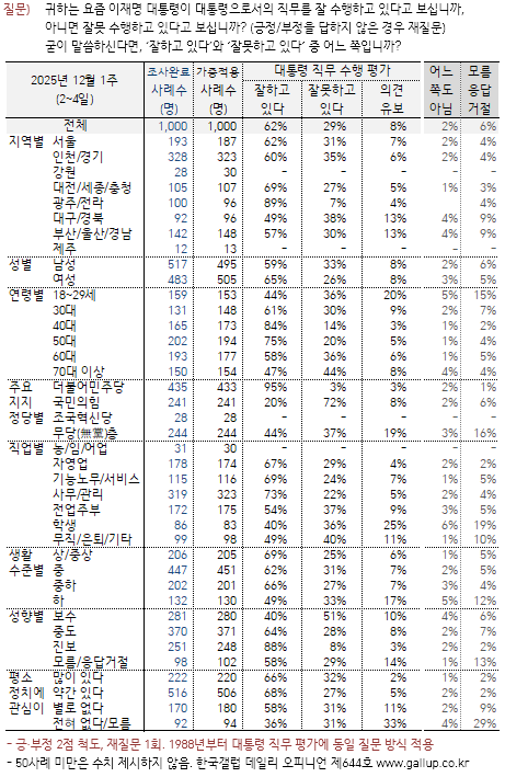 Çѱ¹°¶·´ÀÌ 2025³â 12¿ù ù° ÁÖ(2~4ÀÏ) Àü±¹ ¸¸ 18¼¼ ÀÌ»ó À¯±ÇÀÚ 1,000¸í¿¡°Ô ÀÌÀç¸í ´ëÅë·ÉÀÌ ÇöÀç ´ëÅë·ÉÀ¸·Î¼ÀÇ Á÷¹«¸¦ Àß ¼öÇàÇϰí ÀÖ´Ù°í º¸´ÂÁö À߸ø ¼öÇàÇϰí ÀÖ´Ù°í º¸´ÂÁö ¹°Àº °á°ú(2Á¡ ôµµ, ÀçÁú¹® 1ȸ), 62%°¡ ±àÁ¤ Æò°¡Çß°í 29%´Â ºÎÁ¤ Æò°¡Çß´Ù. 8%´Â ÀǰßÀ» À¯º¸Çß´Ù.