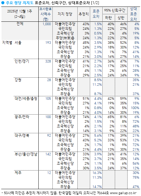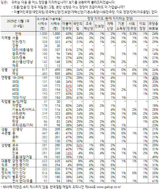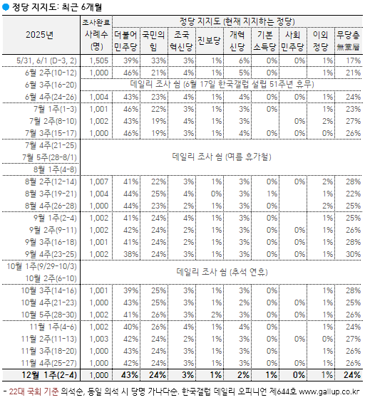 2025³â 12¿ù ù° ÁÖ(2~4ÀÏ) ÇöÀç ÁöÁöÇÏ´Â Á¤´çÀº(´ç¸í ·ÎÅ×À̼Ç, ÀçÁú¹® 1ȸ) ´õºÒ¾î¹ÎÁÖ´ç 43%, ±¹¹ÎÀÇÈû 24%, Á¶±¹Çõ½Å´ç 3%, °³Çõ½Å´ç 2%, Áøº¸´ç, ±âº»¼Òµæ´ç °¢°¢ 1%, ÀÌ¿Ü Á¤´ç/´Üü 1%, ÁöÁöÇÏ´Â Á¤´ç ¾ø´Â ¹«´ç(ÙíÓÚ)Ãþ 24%´Ù. 8¿ù Áß¼ø ÀÌÈÄ ¿©´ç ÁöÁöµµ 40% ³»¿Ü, ±¹¹ÎÀÇÈû 20%´ë Áß¹Ý ±¸µµ°¡ À̾îÁö°í ÀÖ´Ù.