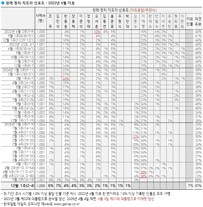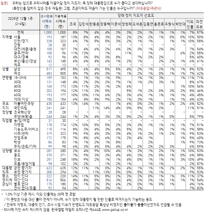 Çѱ¹°¶·´ÀÌ 2025³â 12¿ù 2~4ÀÏ Àü±¹ À¯±ÇÀÚ 1,000¸í¿¡°Ô ¾ÕÀ¸·Î ¿ì¸®³ª¶ó¸¦ À̲ø¾î°¥ Á¤Ä¡ ÁöµµÀÚ, Áï Àå·¡ ´ëÅë·É°¨À¸·Î ´©°¡ ÁÁ´Ù°í »ý°¢ÇÏ´ÂÁö ¹°Àº °á°ú(ÀÚÀ¯ÀÀ´ä), Á¶±¹ Á¶±¹Çõ½Å´ç ´ëÇ¥ 8%, ±è¹Î¼® ±¹¹«ÃѸ® 7%, Çѵ¿ÈÆ Àü ±¹¹ÎÀÇÈû ´ëÇ¥, À嵿Çõ ±¹¹ÎÀÇÈû ´ëÇ¥ °¢°¢ 4%, ÀÌÁؼ® °³Çõ½Å´ç ´ëÇ¥, Á¤Ã»·¡ ´õºÒ¾î¹ÎÁÖ´ç ´ëÇ¥ °¢°¢ 3%, ¿À¼¼ÈÆ ¼¿ï½ÃÀå 2%, ±èµ¿¿¬ °æ±âµµÁö»ç, È«ÁØÇ¥ Àü ´ë±¸½ÃÀå, ¿ì¿ø½Ä ±¹È¸ÀÇÀå, ¹ÚÂù´ë ´õºÒ¾î¹ÎÁÖ´ç ÀÇ¿ø °¢°¢ 1% ¼øÀ¸·Î ³ªÅ¸³µ´Ù. 7%´Â ÀÌ¿Ü Àι°(1.0% ¹Ì¸¸ 20¿© ¸í Æ÷ÇÔ), 57%´Â ƯÁ¤ÀÎÀ» ´äÇÏÁö ¾Ê¾Ò´Ù.