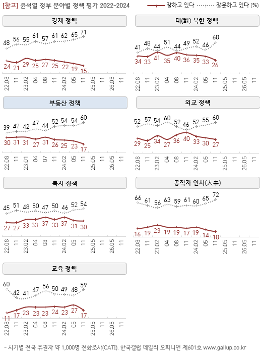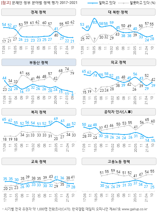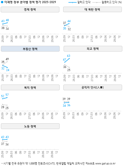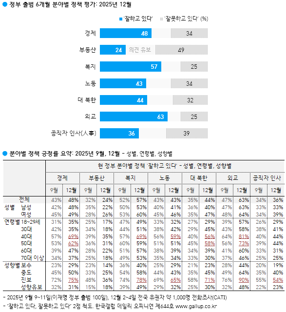 ÀÌÀç¸í Á¤ºÎ Ãâ¹ü 6°³¿ùÀ» ¸Â¾Æ °æÁ¦, ºÎµ¿»ê, º¹Áö, ³ëµ¿, ´ëºÏ, ¿Ü±³ ºÐ¾ß Á¤Ã¥°ú °øÁ÷ÀÚ ÀÎ»ç °¢°¢¿¡ ´ëÇØ Çö Á¤ºÎ°¡ ÀßÇϰí ÀÖ´ÂÁö, À߸øÇϰí ÀÖ´ÂÁö ¹°¾ú´Ù(2Á¡ ôµµ, ¹®Ç× ·ÎÅ×À̼Ç). ±× °á°ú ¿Ü±³ ºÐ¾ß¿¡´Â 63%°¡ 'ÀßÇϰí ÀÖ´Ù', 25%°¡ 'À߸øÇϰí ÀÖ´Ù'¶ó°í ´äÇß°í, º¹Áö 57%:25%, °æÁ¦ 48%:34%, ´ëºÏ 44%:32%, ³ëµ¿ 43%:34%, °øÁ÷ÀÚ Àλç 36%:39%, ºÎµ¿»ê 24%:49%·Î ³ªÅ¸³µ´Ù.