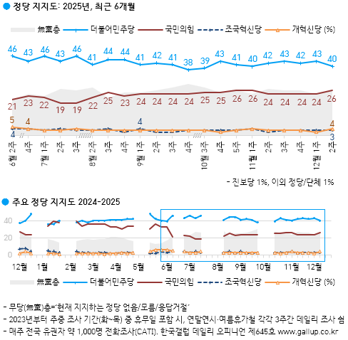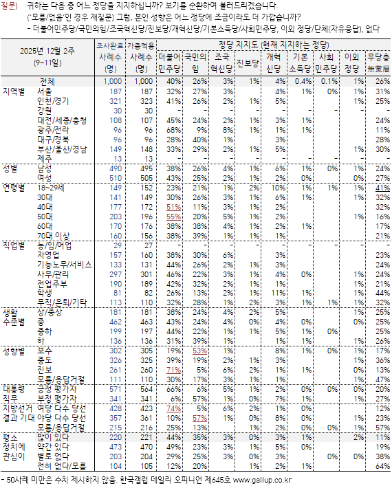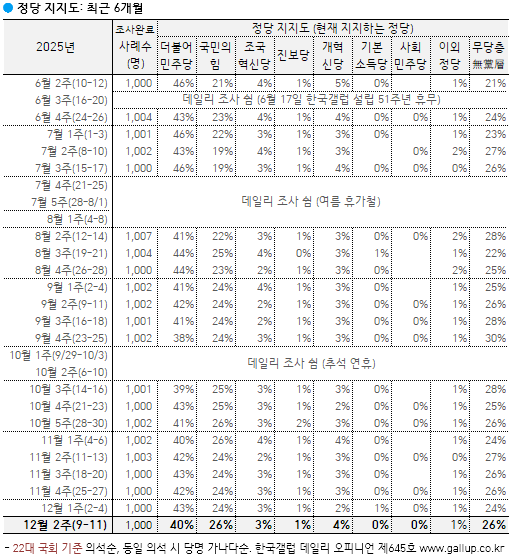 2025³â 12¿ù µÑ° ÁÖ(9~11ÀÏ) ÇöÀç ÁöÁöÇÏ´Â Á¤´çÀº(´ç¸í ·ÎÅ×À̼Ç, ÀçÁú¹® 1ȸ) ´õºÒ¾î¹ÎÁÖ´ç 40%, ±¹¹ÎÀÇÈû 26%, °³Çõ½Å´ç 4%, Á¶±¹Çõ½Å´ç 3%, Áøº¸´ç 1%, ÀÌ¿Ü Á¤´ç/´Üü 1%, ÁöÁöÇÏ´Â Á¤´ç ¾ø´Â ¹«´ç(ÙíÓÚ)Ãþ 26%´Ù. 8¿ù Áß¼ø ÀÌÈÄ ¿©´ç ÁöÁöµµ 40% ³»¿Ü, ±¹¹ÎÀÇÈû 20%´ë Áß¹Ý ±¸µµ°¡ À̾îÁö°í ÀÖ´Ù.