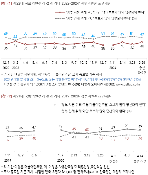 Âü°í·Î, 2022³â 12¿ùºÎÅÍ 2024³â 3¿ù±îÁö´Â ÃѼ± °á°ú ±â´ë¸¦ Á¤ºÎ Áö¿ø·Ð°ú °ßÁ¦·Ð ±¸µµ·Î ¸Å¿ù ¹°¾ú´Ù. 2023³â 3¿ù¸¸ Á¤ºÎ Áö¿ø·Ð(42%)°ú °ßÁ¦·Ð(44%)ÀÌ ºñµîÇß°í, ±× ¿Ü´Â ÁÙ°ð °ßÁ¦·Ð ¿ì¼¼ ±¸µµ·Î À¯ÁöµÆ´Ù. Á¦22´ë ±¹È¸ÀÇ¿ø¼±°Å¿¡¼ ´ç½Ã ¾ß´çÀÌ´ø ´õºÒ¾î¹ÎÁÖ´çÀº ¼Ò¼Ó Áö¿ª±¸ Èĺ¸ µæÇ¥À² ÃÑÇÕ 51%·Î Àüü Áö¿ª±¸ 254¼® Áß 63%(161¼®)¸¦ Â÷ÁöÇß°í, ¿©´çÀÌ´ø ±¹¹ÎÀÇÈûÀº ¼Ò¼Ó Áö¿ª±¸ Èĺ¸ µæÇ¥À² ÃÑÇÕ 45%·Î Áö¿ª±¸ÀÇ 36%(90¼®)¸¦ ¾ò¾ú´Ù(→ [Á¶»çÓÈ] Á¤´çº° ÀǼ®¼ö¿Í µæÇ¥À² Â÷ÀÌ).