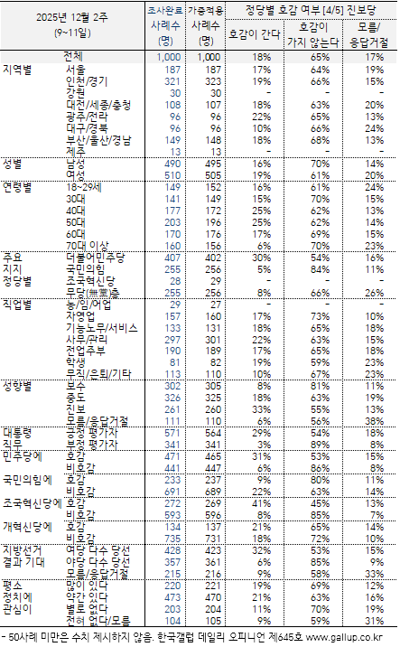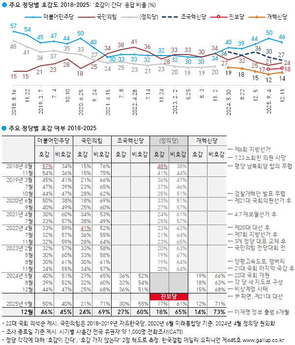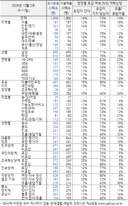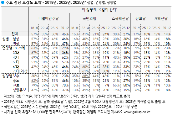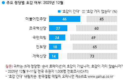2025³â 12¿ù 9~11ÀÏ Àü±¹ ¸¸ 18¼¼ ÀÌ»ó À¯±ÇÀÚ 1,000¸í¿¡°Ô 5°³ Á¤´çº° È£°¨ ¿©ºÎ¸¦ ¹°¾ú´Ù(¼ø¼ ·ÎÅ×À̼Ç). ±× °á°ú ´õºÒ¾î¹ÎÁÖ´ç¿¡´Â 46%°¡ 'È£°¨ÀÌ °£´Ù'(ÀÌÇÏ 'È£°¨µµ'), 45%°¡ 'È£°¨ °¡Áö ¾Ê´Â´Ù'(ÀÌÇÏ 'ºñÈ£°¨µµ')¶ó°í ´äÇß°í, Á¶±¹Çõ½Å´çÀº 27%:60%, ±¹¹ÎÀÇÈû 24%:69%, Áøº¸´ç 18%:65%, °³Çõ½Å´ç 14%:73%´Ù.