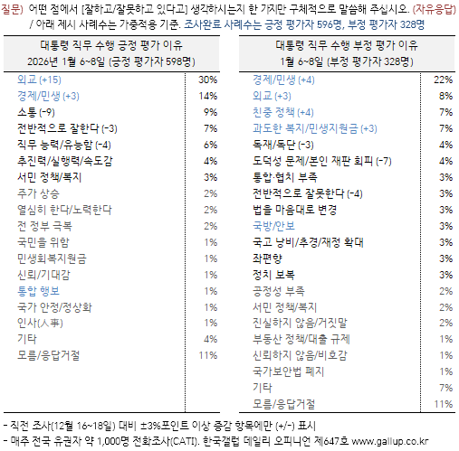 Çѱ¹°¶·´ÀÌ 2026³â 1¿ù µÑ° ÁÖ(6~8ÀÏ) Àü±¹ ¸¸ 18¼¼ ÀÌ»ó À¯±ÇÀÚ 1,000¸í¿¡°Ô ÀÌÀç¸í ´ëÅë·ÉÀÌ ÇöÀç ´ëÅë·ÉÀ¸·Î¼ÀÇ Á÷¹«¸¦ Àß ¼öÇàÇϰí ÀÖ´Ù°í º¸´ÂÁö À߸ø ¼öÇàÇϰí ÀÖ´Ù°í º¸´ÂÁö ¹°Àº °á°ú(2Á¡ ôµµ, ÀçÁú¹® 1ȸ), 60%°¡ ±àÁ¤ Æò°¡Çß°í 33%´Â ºÎÁ¤ Æò°¡Çß´Ù. 7%´Â ÀǰßÀ» À¯º¸Çß´Ù.