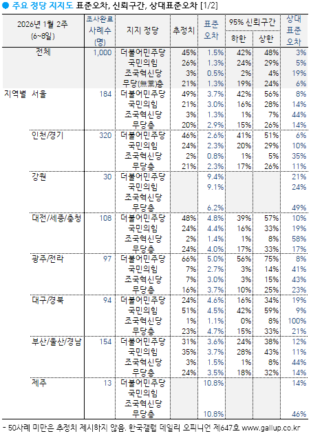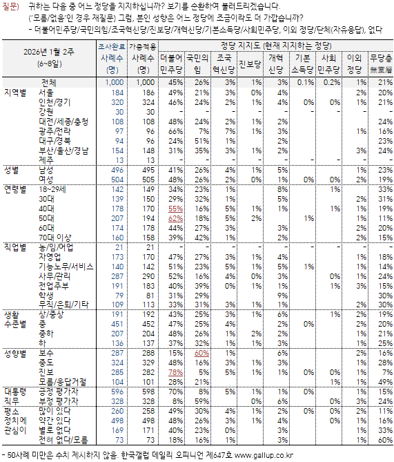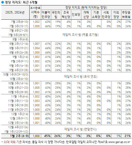 2026³â 1¿ù µÑ° ÁÖ(6~8ÀÏ) ÇöÀç ÁöÁöÇÏ´Â Á¤´çÀº(´ç¸í ·ÎÅ×À̼Ç, ÀçÁú¹® 1ȸ) ´õºÒ¾î¹ÎÁÖ´ç 45%, ±¹¹ÎÀÇÈû 26%, Á¶±¹Çõ½Å´ç, °³Çõ½Å´ç °¢°¢ 3%, Áøº¸´ç 1%, ÀÌ¿Ü Á¤´ç/´Üü 1%, ÁöÁöÇÏ´Â Á¤´ç ¾ø´Â ¹«´ç(ÙíÓÚ)Ãþ 21%´Ù. 8¿ù Áß¼ø ÀÌÈÄ ¿©´ç ÁöÁöµµ 40% ³»¿Ü, ±¹¹ÎÀÇÈû 20%´ë Áß¹Ý ±¸µµ°¡ À̾îÁö°í ÀÖ´Ù.