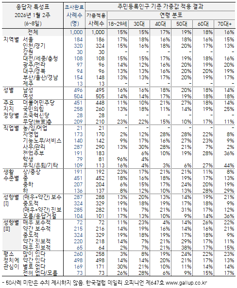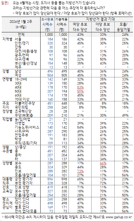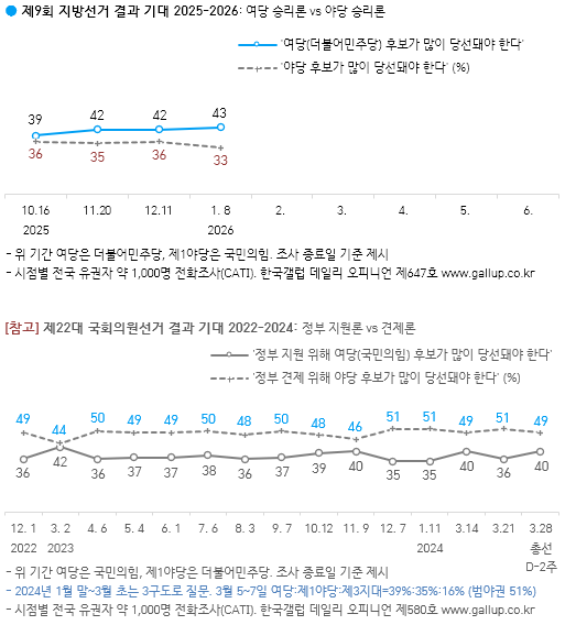 ¿À´Â 6¿ù 3ÀÏ Á¦9ȸ Áö¹æ¼±°Å°¡ Ä¡·¯Áø´Ù. 2026³â 1¿ù 6~8ÀÏ, Áö¹æ¼±°Å °ü·Ã µÎ °¡Áö ÁÖÀåÀ» Á¦½ÃÇÏ°í ¾î´À ÂÊ¿¡ ´õ µ¿ÀÇÇÏ´ÂÁö ¹°¾ú´Ù(Ç׸ñ ·ÎÅ×À̼Ç). ±× °á°ú '¿©´ç È帰¡ ¸¹ÀÌ ´ç¼±µÅ¾ß ÇÑ´Ù' 43%, '¾ß´ç È帰¡ ¸¹ÀÌ ´ç¼±µÅ¾ß ÇÑ´Ù' 33%·Î ¾ç·Ð °ÝÂ÷°¡ 3°³¿ù Àü 3%Æ÷ÀÎÆ®¿¡¼ 10%Æ÷ÀÎÆ®·Î Ä¿Á³´Ù. 24%´Â ÀǰßÀ» À¯º¸Çß´Ù. ¼ºÇâ Áøº¸ÃþÀÇ 73%´Â ¿©´ç ½Â¸®, º¸¼öÃþÀÇ 66%´Â ¾ß´ç ½Â¸®¸¦ ±â´ëÇß´Ù. ÁßµµÃþÀº ¾ß´ç(28%)º¸´Ù ¿©´ç(44%) ÂÊÀ¸·Î ±â¿î´Ù.