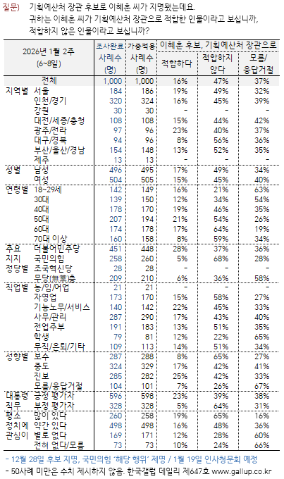 Áö³ 12¿ù 28ÀÏ ±âȹ¿¹»êó ÃÊ´ë Àå°ü È帷ΠÀÌÇýÈÆ Àü ±¹¹ÎÀÇÈû ÀÇ¿øÀÌ Áö¸íµÆ´Ù. 2026³â 1¿ù 6~8ÀÏ, ÀÌÇýÈÆ Èĺ¸¿¡ ´ëÇÑ À¯±ÇÀÚÀÇ »ý°¢Àº '±âȹ¿¹»êó Àå°üÀ¸·Î ÀûÇÕÇÏ´Ù' 16%, 'ÀûÇÕÇÏÁö ¾Ê´Ù' 47%, ÀÇ°ß À¯º¸ 37%´Ù. ´ëºÎºÐ ÀÀ´äÀÚ Æ¯¼º¿¡¼ ºÎÀûÇÕÇÏ´Ù´Â ½Ã°¢ÀÌ ¿ì¼¼Çϸç, ƯÈ÷ ´õºÒ¾î¹ÎÁÖ´ç ÁöÁöÃþ(37%)º¸´Ù ±¹¹ÎÀÇÈû ÁöÁöÃþ(68%)¿¡¼ ´õ ºÎÁ¤ÀûÀÌ´Ù.