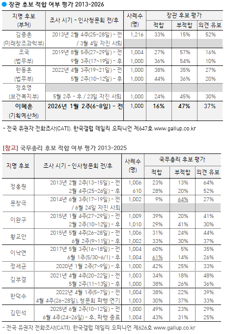 ¡Ý Âü°í·Î, Çѱ¹°¶·´Àº 2013³âºÎÅÍ 2025³â±îÁö Àå°ü Èĺ¸ 4ÀÎ, ±¹¹«ÃѸ® Èĺ¸ 9Àο¡ ´ëÇÑ Àλçû¹®È¸ ÀüÈÄ ÀûÇÕ ¿©ºÎ¸¦ Á¶»çÇß´Ù. °ú°Å ÀûÇÕµµ°¡ °¡Àå ³·°Ô Æò°¡µÈ Àι°Àº 2014³â 6¿ù ±¹¹«ÃѸ® Èĺ¸ ¹®Ã¢±Ø(9%), 2022³â 5¿ù º¸°Çº¹ÁöºÎ Àå°ü Èĺ¸ Á¤È£¿µ(24%)ÀÌ¸ç µÑ ´Ù Àλçû¹®È¸ ÀüÈÄ ÀÚÁø »çÅðÇß´Ù.