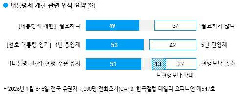 Çѱ¹°¶·´ÀÌ 2026³â 1¿ù 6~8ÀÏ Àü±¹ À¯±ÇÀÚ 1,000¸í¿¡°Ô ÇöÇà ´ëÅë·ÉÁ¦¸¦ ¹Ù²Ù´Â °³ÇåÀÌ ÇÊ¿äÇÑÁö ¹°¾ú´Ù. ±× °á°ú 'ÇÊ¿äÇÏ´Ù' 49%, 'ÇÊ¿äÇÏÁö ¾Ê´Ù' 37%·Î ³ªÅ¸³µ´Ù. 15%´Â ÀǰßÀ» À¯º¸Çß´Ù. ÀÛ³â 3¿ù¿¡´Â ÇÊ¿ä 54%, ºÒÇÊ¿ä 30%¿´°í, Á¤Ä¡Àû ¼ºÇ⺰ °ßÇØÂ÷µµ µÎµå·¯ÁöÁö ¾Ê¾ÒÀ¸³ª Áö±ÝÀº º¸¼öÃþ Áß·ÐÀÌ ºÒÇÊ¿äÇÏ´Ù´Â ÂÊÀ¸·Î ¹Ù²î¾ú´Ù(→ Á¦614È£).