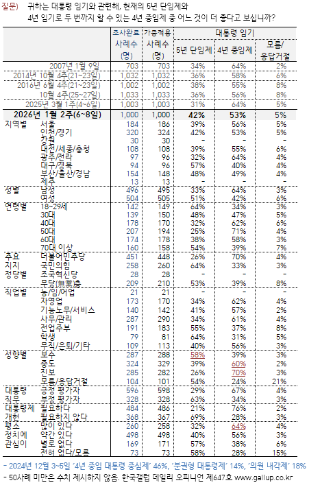 ´ëÅë·É ÀÓ±â: '4³â ÁßÀÓÁ¦' 53%, '5³â ´ÜÀÓÁ¦' 42%