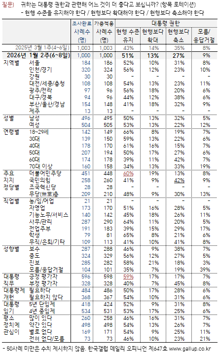 ´ëÅë·É ±ÇÇÑ¿¡ °üÇØ¼´Â 'ÇöÇà ¼öÁØ À¯Áö' 51%, 'ÇöÇຸ´Ù Ãà¼Ò' 27%, 'ÇöÇຸ´Ù È®´ë' 13%·Î ³ªÅ¸³µ´Ù. 9%´Â ÀǰßÀ» À¯º¸Çß´Ù. ´ëÅë·ÉÁ¦ °³Çå ÇÊ¿ä ¿©ºÎ³ª ¼±È£ Àӱ⿡ µû¸¥ °ßÇØÂ÷´Â Å©Áö ¾Ê´Ù. Çö ´ëÅë·É Á÷¹« ±àÁ¤ Æò°¡ÀÚ, ¿©´ç ÁöÁöÃþ¿¡¼µµ ÇöÇà ¼öÁØ À¯Áö°¡ ¾à 60%¸¦ Â÷ÁöÇÑ´Ù. ÇÑÆí ´ëÅë·É ºÎÁ¤ Æò°¡ÀÚ, ±¹¹ÎÀÇÈû ÁöÁöÃþ¿¡¼´Â ÇöÇà ¼öÁØ À¯Áö¿Í Ãà¼Ò°¡ °¢°¢ 40%´ë·Î ºñµîÇÏ´Ù.