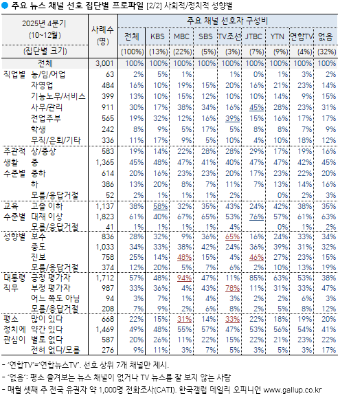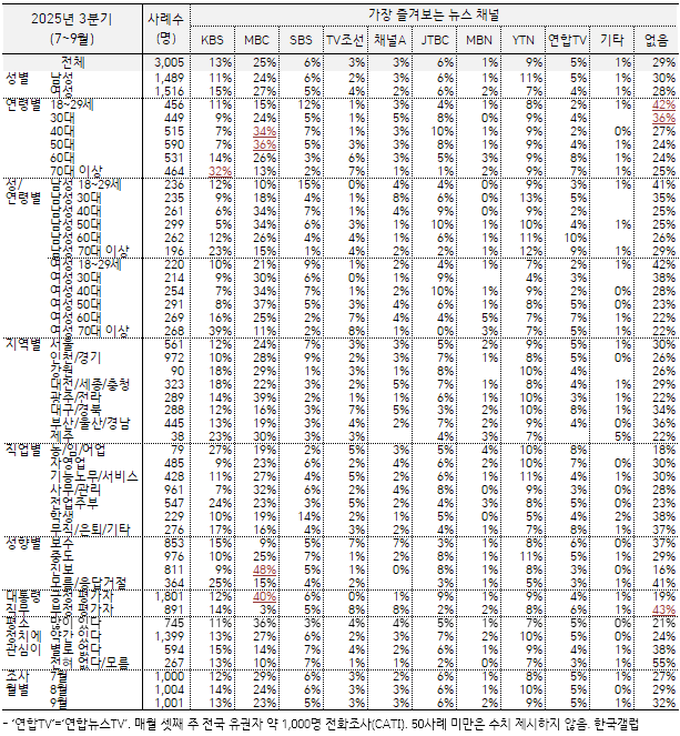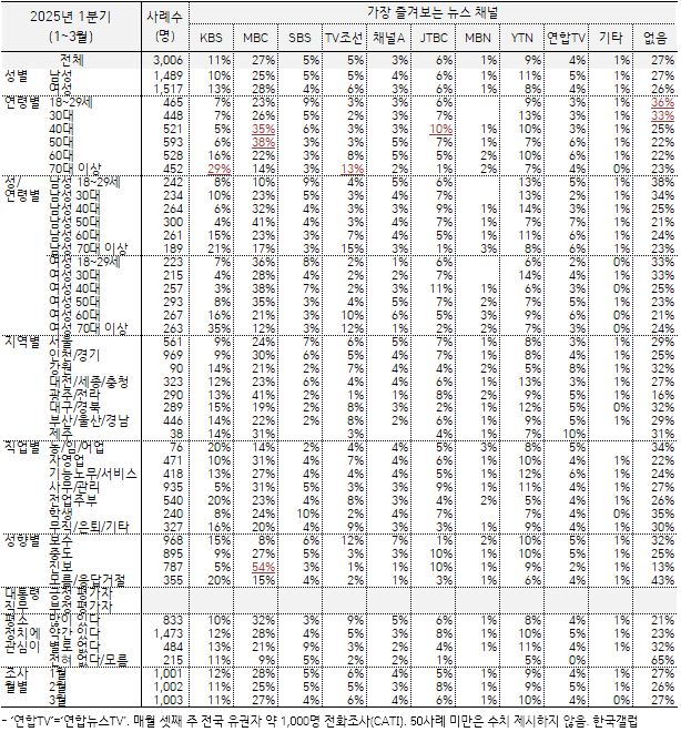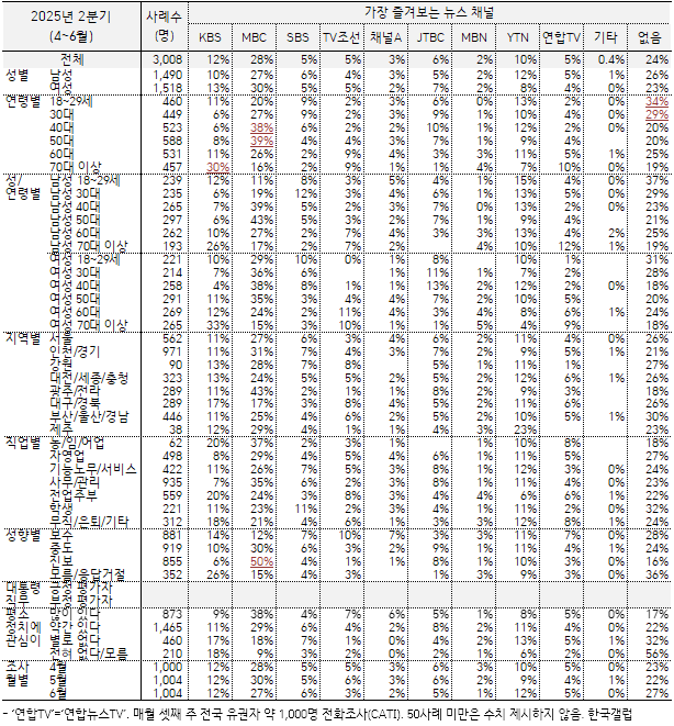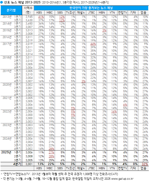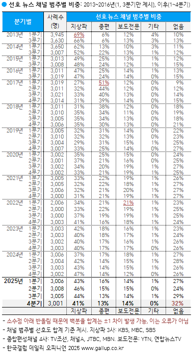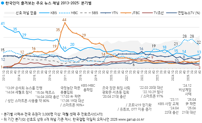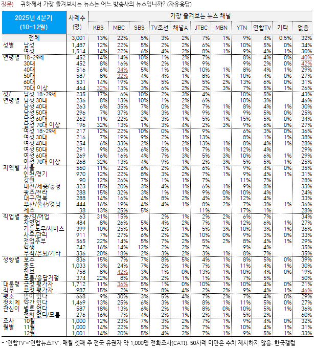 [2025³â 4ºÐ±â] ¼±È£ ´º½º ä³Î: MBC 22%, KBS 13%, YTN 9%, JTBC 7%...