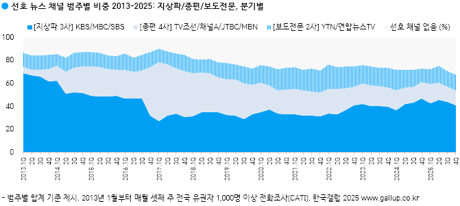 ¡Ý ¹æ¼Û ´º½º ä³Î ¿µÇâ·ÂÀº Àü¸¸ ¸øÇÑ °ÍÀ¸·Î º¸ÀδÙ. Æò¼Ò 'Áñ°Üº¸´Â ´º½º ä³ÎÀÌ ¾ø´Ù'´Â »ç¶÷ÀÌ 2025³â 4ºÐ±â ±âÁØ 32%·Î, 2013³â ÀÌÈÄ ÃÖ´ëÄ¡¿¡ ´ÞÇß´Ù. 2024³â 10·11¿ù 28%¿¡¼ 12¿ù 21%·Î ÁÙ¾î, ºñ»ó°è¾ö »çŰ¡ ½ÃûÀÚÀÇ ´«±æÀ» ´º½º·Î ¸ðÀº µíÇßÁö¸¸ 2017³â źÇÙ ±¹¸é¿¡´Â ±× ºñÀ²ÀÌ 9%¿´À¸´Ï ±×¶§¸¸ ¸øÇß´Ù°í º¼ ¼ö ÀÖ´Ù.