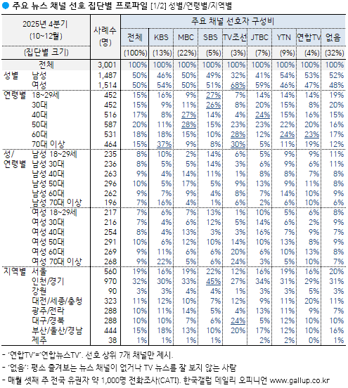 Çѱ¹°¶·´ÀÌ 2025³â 10~12¿ù Àü±¹ ¸¸ 18¼¼ ÀÌ»ó À¯±ÇÀÚ 3,001¸í¿¡°Ô ¿äÁò ¾î´À ¹æ¼Û»ç ´º½º¸¦ °¡Àå Áñ°Üº¸´ÂÁö ¹°Àº °á°ú(ÀÚÀ¯ÀÀ´ä) MBC 22%, KBS 13%, YTN 9%, JTBC 7%, SBS 5%, ¿¬ÇÕ´º½ºTV 4%, TVÁ¶¼± 3%, ä³ÎA 2%, MBN 1% ¼øÀ¸·Î ³ªÅ¸³µÀ¸¸ç 32%´Â Ưº°È÷ Áñ°Üº¸´Â ä³ÎÀÌ ¾ø´Ù°í ´äÇß´Ù.