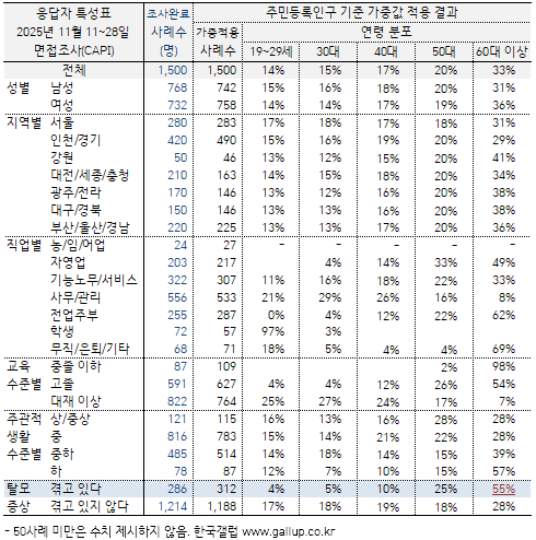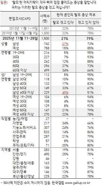 Çѱ¹°¶·´ÀÌ 2025³â 11¿ù 11~28ÀÏ Àü±¹(Á¦ÁÖ Á¦¿Ü) ¸¸ 19¼¼ ÀÌ»ó 1,500¸í¿¡°Ô ¸Ó¸®Ä«¶ôÀÌ ÀÚ²Ù ºüÁ® Á¡Á¡ ÁÙ¾îµå´Â Áõ»óÀÌ ÀÖ´ÂÁö ¹°Àº °á°ú 21%°¡ 'ÇöÀç Å»¸ð Áõ»óÀ» °Þ°í ÀÖ´Ù'°í ´äÇß´Ù. ÀÌ´Â Áö³ 2013³â, 2019³âÀÇ 22%¿Í ´ëµ¿¼ÒÀÌÇÑ ¼öÄ¡´Ù.