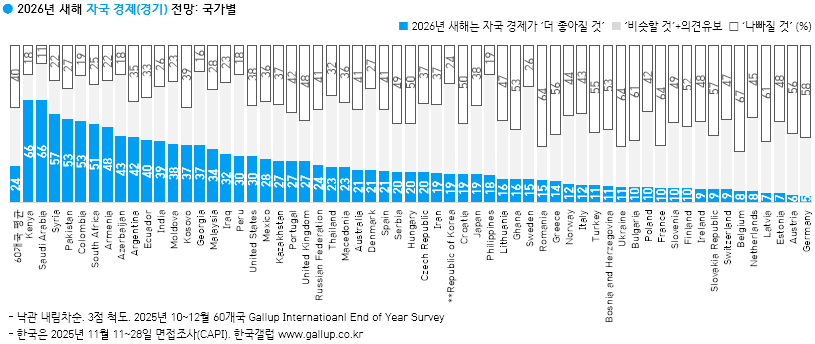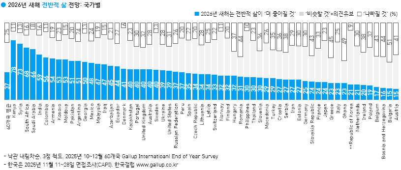¡Ý »õÇØ Àü¸ÁÀ» °¡Àå ¹à°Ô º¸´Â ³ª¶ó´Â ÄɳķÎ, 78%°¡ '2026³âÀÌ 2025³âº¸´Ù ÁÁ¾ÆÁú °Í'À̶ó°í ´äÇß´Ù. ±×´ÙÀ½Àº ½Ã¸®¾Æ(73%), ³²¾ÆÇÁ¸®Ä«°øÈ±¹(68%), »ç¿ìµð¾Æ¶óºñ¾Æ(66%), Àεµ(59%), ÄÝ·Òºñ¾Æ(56%), ¾Æ¸£¸Þ´Ï¾Æ(54%) ¼øÀÌ´Ù. ÇÑÆí, ¿ì¸® ÁÖº¯±¹ Áß¿¡¼´Â ¹Ì±¹(39%)°ú ·¯½Ã¾Æ(37%)°¡ 60°³±¹ Æò±Õ ¼öÁØ, ÀϺ»(24%)Àº ¿ì¸®³ª¶ó(21%)¿Í ÇÔ²² ÇÏÀ§±Ç¿¡ ¼ÓÇß´Ù.