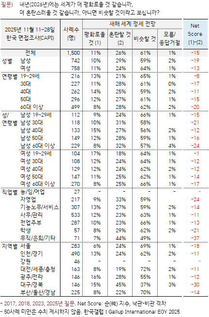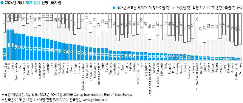 2026³â »õÇØ ¼¼°è Á¤¼¼¿¡ °üÇØ¼´Â 26%°¡ '´õ ÆòÈ·Î¿ï °Í', 40%°¡ '´õ È¥¶õ½º·¯¿ï °Í', 'ºñ½ÁÇÒ °Í' 28%·Î ºñ°ü·ÐÀÌ ³«°ü·ÐÀ» ¾Õ¼¹´Ù. °¡Àå ³«°üÀûÀÎ ³ª¶ó´Â ½Ã¸®¾Æ¿Í ÄɳķÎ, »õÇØ ¼¼°è°¡ '´õ ÆòÈ·Î¿ï °Í'À̶õ ÀÀ´äÀÌ °¢°¢ 66%¸¦ Â÷ÁöÇß´Ù. »ç¿ìµð¾Æ¶óºñ¾Æ(58%), Æä·ç·³²¾ÆÇÁ¸®Ä«°øÈ±¹(57%), ÆÄŰ½ºÅº·¾Æ¸£¸Þ´Ï¾Æ(52%), ¿¡Äâµµ¸£·Ä«ÀÚÈ彺ź(51%) µî¿¡¼µµ ³«°ü·ÐÀÌ 50%¸¦ ³Ñ¾ú´Ù.