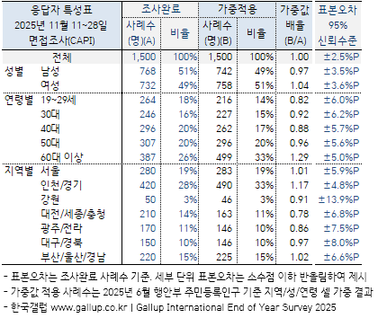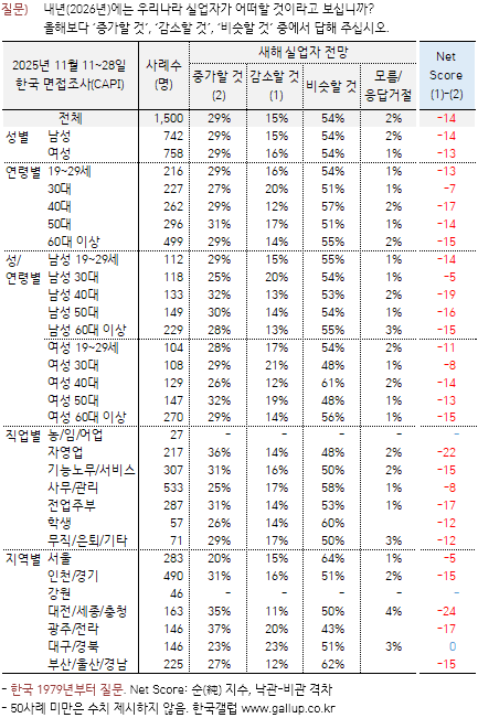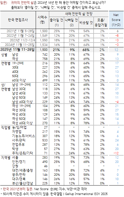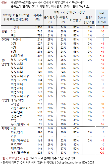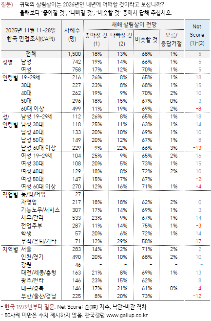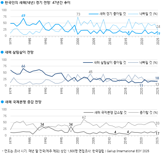 Çѱ¹°¶·´ÀÌ 2025³â 11¿ù 11~28ÀÏ Àü±¹(Á¦ÁÖ Á¦¿Ü)ÀÇ ¸¸ 19¼¼ ÀÌ»ó 1,500¸í¿¡°Ô »õÇØ ¿ì¸®³ª¶ó °æÁ¦°¡ ¾î¶°ÇÒ °ÍÀ̶ó°í º¸´ÂÁö ¹°¾ú´Ù. ±× °á°ú, Çѱ¹ ¼ºÀÎ Áß 19%°¡ 'ÁÁ¾ÆÁú °Í', 24%´Â '³ªºüÁú °Í', 55%´Â 'ºñ½ÁÇÒ °Í'À̶ó°í ´äÇß´Ù. »õÇØ °æ±â ³«°ü·ÐÀº Àü³â ´ëºñ 10%Æ÷ÀÎÆ® Áõ°¡, ºñ°ü·ÐÀº 23%Æ÷ÀÎÆ® °¨¼ÒÇß´Ù.