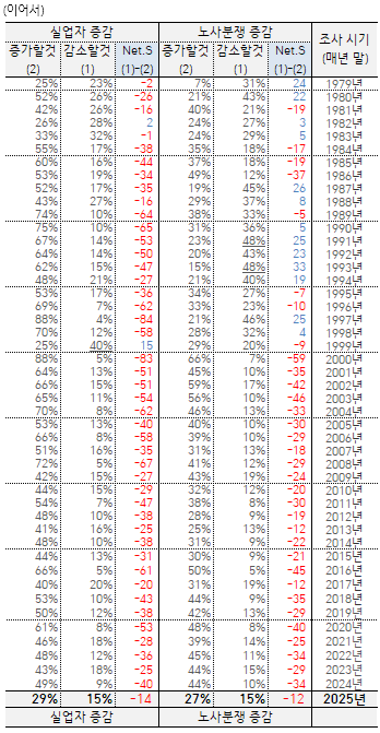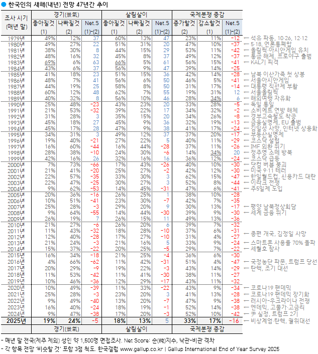 ¡Ý °ú°Å Çѱ¹ÀÎÀÇ °æ±â Àü¸Á ÃßÀ̸¦ º¸¸é, 1980³â´ë´Â ÁÖ·Î ³«°ü·ÐÀÌ ºñ°ü·ÐÀ» Å©°Ô ¾Õ¼¹À¸³ª 1990³â´ë´Â ³«°ü°ú ºñ°ü ¿ì¼¼°¡ ±³Â÷ È¥ÀçÇß°í 2000³â´ë µé¾î¼´Â ´ëü·Î ºñ°ü·ÐÀÌ ¿ì¼¼Çß´Ù. 1979³âºÎÅÍ 2022³â±îÁö 47³â°£ Á¶»ç Áß '»õÇØ °æ±â°¡ ÁÁ¾ÆÁú °Í'À̶õ ³«°ü·Ð ÃÖ°íÄ¡´Â 1983³âÀÇ 69%, ÃÖÀúÄ¡´Â ±¹Á¤³ó´Ü ÆÄ¹®ÀÌ °Å¼Ã´ø 2016³âÀÇ 4%´Ù.