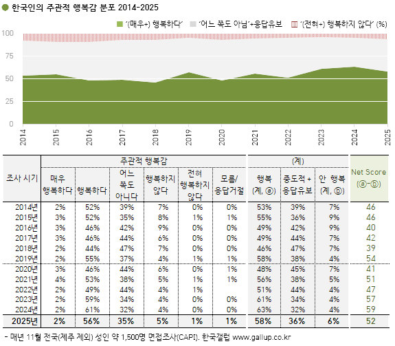 º»ÀÎ »îÀÌ ¾ó¸¶³ª ÇູÇÏ´Ù°í »ý°¢ÇÏ´ÂÁö, ȤÀº ÇູÇÏÁö ¾Ê´Ù°í »ý°¢ÇÏ´ÂÁö ¹°¾ú´Ù(5Á¡ ôµµ). ±× °á°ú Çѱ¹ÀÎ Áß 58%°¡ »îÀÌ 'ÇູÇÏ´Ù', 6%°¡ 'ÇູÇÏÁö ¾Ê´Ù', 35%°¡ '¾î´À Âʵµ ¾Æ´Ï´Ù'¶ó°í ´äÇß´Ù. 2014³â ÀÌÈÄ Çѱ¹ÀÎÀÇ ÁÖ°üÀû Çູ°¨ ¼øÁö¼ö('Çູ'-'¾È Çູ' ÀÀ´ä Â÷ÀÌ)´Â 2018³â 39°¡ ÃÖÀú, 2024³â 59°¡ ÃÖ°í´Ù.