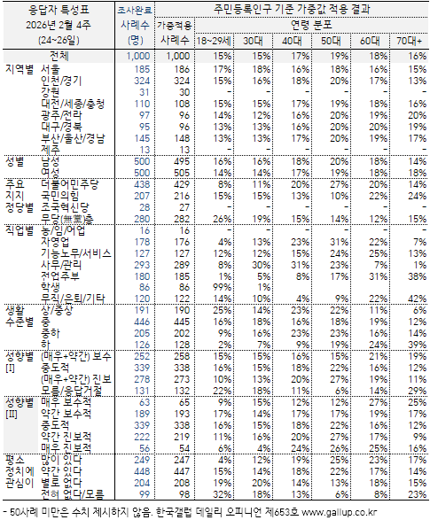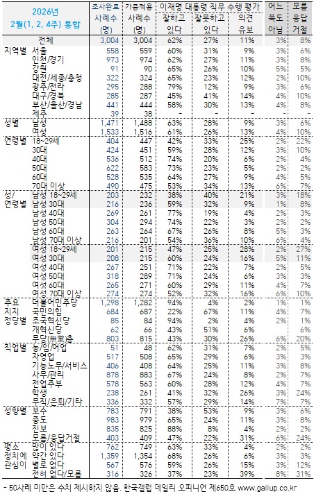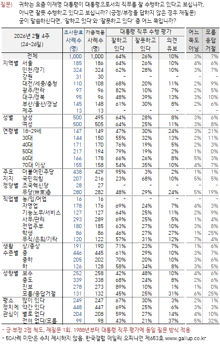 Çѱ¹°¶·´ÀÌ 2026³â 2¿ù ³Ý° ÁÖ(24~26ÀÏ) Àü±¹ ¸¸ 18¼¼ ÀÌ»ó À¯±ÇÀÚ 1,000¸í¿¡°Ô ÀÌÀç¸í ´ëÅë·ÉÀÌ ÇöÀç ´ëÅë·ÉÀ¸·Î¼ÀÇ Á÷¹«¸¦ Àß ¼öÇàÇϰí ÀÖ´Ù°í º¸´ÂÁö À߸ø ¼öÇàÇϰí ÀÖ´Ù°í º¸´ÂÁö ¹°Àº °á°ú(2Á¡ ôµµ, ÀçÁú¹® 1ȸ), 64%°¡ ±àÁ¤ Æò°¡Çß°í 26%´Â ºÎÁ¤ Æò°¡Çß´Ù. 10%´Â ÀǰßÀ» À¯º¸Çß´Ù.