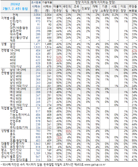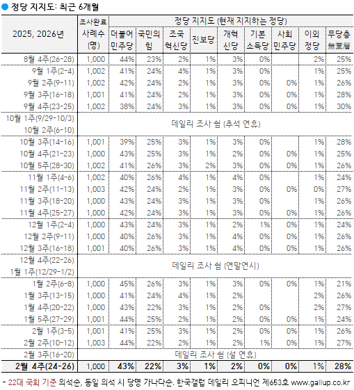 2026³â 2¿ù ³Ý° ÁÖ(24~26ÀÏ) ÇöÀç ÁöÁöÇÏ´Â Á¤´çÀº(´ç¸í ·ÎÅ×À̼Ç, ÀçÁú¹® 1ȸ) ´õºÒ¾î¹ÎÁÖ´ç 43%, ±¹¹ÎÀÇÈû 22%, Á¶±¹Çõ½Å´ç 3%, °³Çõ½Å´ç 2%, Áøº¸´ç 1%, ÀÌ¿Ü Á¤´ç/´Üü 1%, ÁöÁöÇÏ´Â Á¤´ç ¾ø´Â ¹«´ç(ÙíÓÚ)Ãþ 28%´Ù. ÀÛ³â 8¿ù Áß¼ø ÀÌÈÄ ¿©´ç ÁöÁöµµ 40% ³»¿Ü, ±¹¹ÎÀÇÈû 20%´ë ÃÊÁß¹Ý ±¸µµ°¡ Áö¼ÓµÇ°í ÀÖ´Ù.