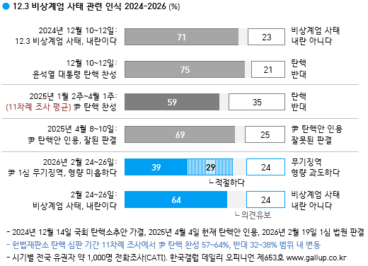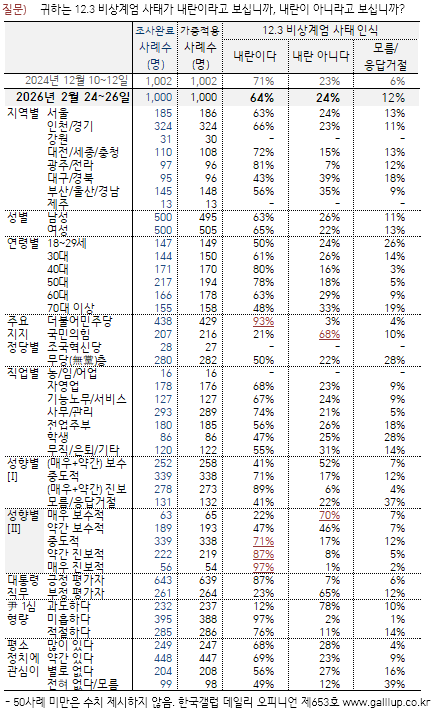 12.3 ºñ»ó°è¾ö »çÅ¿¡ °üÇØ¼´Â Çö½ÃÁ¡ À¯±ÇÀÚÀÇ 64%°¡ '³»¶õÀÌ´Ù', 24%´Â '³»¶õÀÌ ¾Æ´Ï´Ù'¶ó°í ºÃ´Ù. 12%´Â ÀǰßÀ» À¯º¸Çß´Ù. »çÅ Á÷ÈÄÀÎ 2024³â 12¿ù 10~12ÀÏ Á¶»ç¿¡¼´Â 71%°¡ ³»¶õ, 23%°¡ ¾Æ´Ï¶ó°í ´äÇß´Ù(→ Á¦606È£). Áï, ³»¶õÀ̶õ ÀÀ´äÀÌ 14°³¿ù Àüº¸´Ù 7%Æ÷ÀÎÆ® ÁÙ°í, ÀÇ°ß À¯º¸°¡ ±×¸¸Å ´Ã¾ú´Ù. ÀÌ´Â ÁÖ·Î 20·30´ë¿¡¼ÀÇ º¯È´Ù.