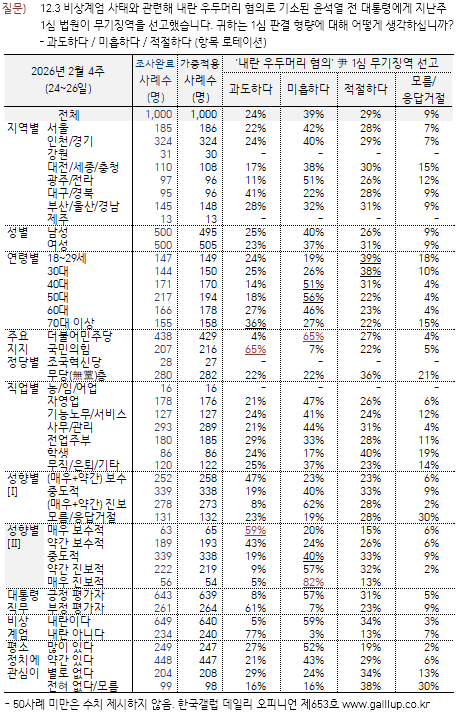 12.3 ºñ»ó°è¾ö »çÅÂ¿Í °ü·ÃÇØ ³»¶õ ¿ìµÎ¸Ó¸® ÇøÀÇ·Î ±â¼ÒµÈ À±¼®¿ Àü ´ëÅë·É¿¡°Ô Áö³ 2¿ù 19ÀÏ 1½É ¹ý¿øÀÌ ¹«±â¡¿ªÀ» ¼±°íÇß´Ù. Çѱ¹°¶·´ÀÌ 2¿ù 24~26ÀÏ Àü±¹ À¯±ÇÀÚ 1,000¸í¿¡°Ô 1½É ÆÇ°á Çü·®¿¡ ´ëÇØ ¾î¶»°Ô »ý°¢ÇÏ´ÂÁö ¹°¾ú´Ù(Ç׸ñ ·ÎÅ×À̼Ç). ±× °á°ú '¹ÌÈíÇÏ´Ù' 39%, 'ÀûÀýÇÏ´Ù' 29%, '°úµµÇÏ´Ù' 24%·Î ³ªÅ¸³µ´Ù. 9%´Â ÀǰßÀ» À¯º¸Çß´Ù.
