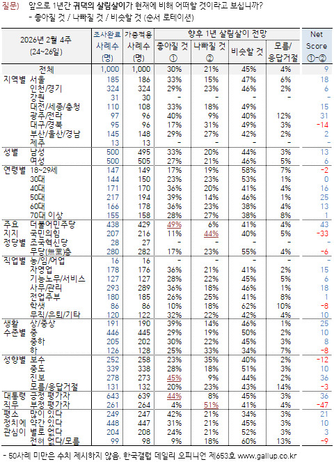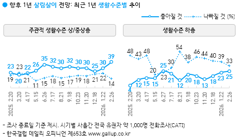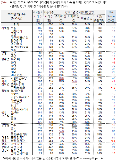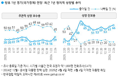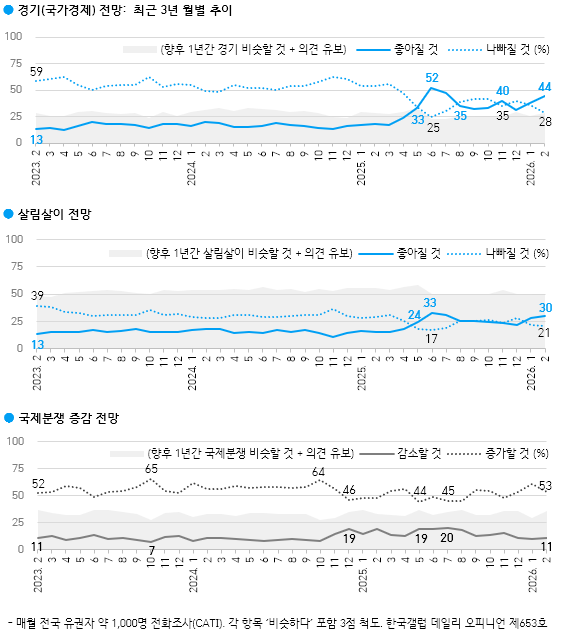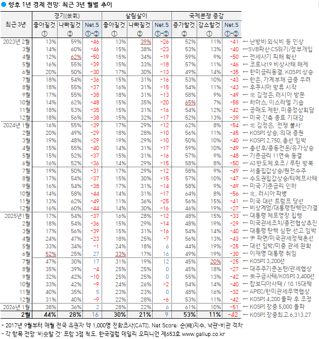 Çѱ¹°¶·´ÀÌ 2026³â 2¿ù 24~26ÀÏ Àü±¹ ¸¸ 18¼¼ ÀÌ»ó 1,000¸í¿¡°Ô ÇâÈÄ 1³â°£ ¿ì¸®³ª¶ó °æ±â Àü¸ÁÀ» ¹°Àº °á°ú 44%°¡ 'ÁÁ¾ÆÁú °Í'À̶ó°í ³»´ÙºÃ°í, 28%´Â '³ªºüÁú °Í', 24%´Â 'ºñ½ÁÇÒ °Í'À̶ó°í ´äÇß´Ù. 4%´Â ÀǰßÀ» À¯º¸Çß´Ù. µÎ ´Þ ¿¬¼Ó ³«°ü·ÐÀÌ ´Ã°í ºñ°ü·ÐÀº ÁÙ¾î ÀÛ³â 7¿ù Çö Á¤ºÎ Ãâ¹ü Ãʱ⠼öÁØ¿¡ ±ÙÁ¢Çß´Ù. ÀÌ´Â »õÇØ µé¾î ÆÄÁ×Áö¼¼·Î »ó½Â, 1¿ù 22ÀÏ ÀåÁß 5,000¼± µ¹ÆÄ¿¡ À̾î 2¿ù 25ÀÏ 6,000¼±±îÁö ³Ñ¾î¼± ÄÚ½ºÇÇ(KOSPI, Á¾ÇÕÁÖ°¡Áö¼ö) ¿µÇâÀ¸·Î ÃßÁ¤µÈ´Ù.