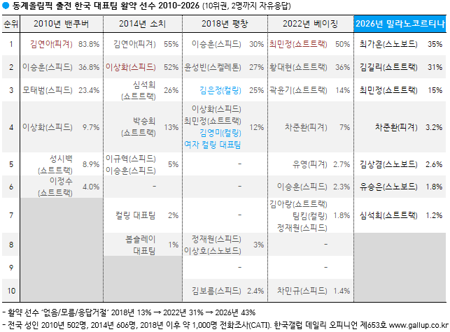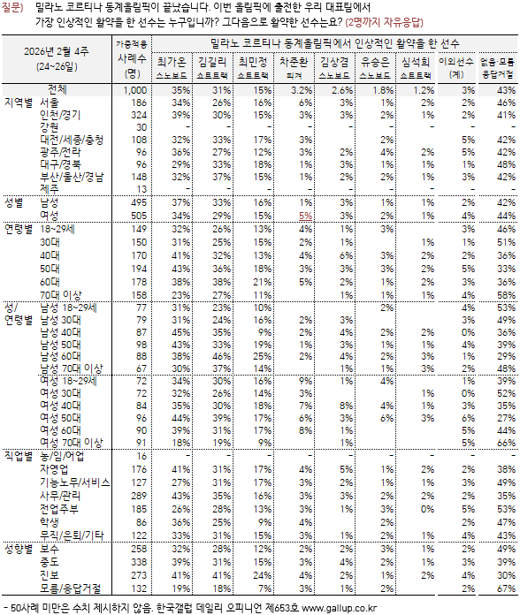 Çѱ¹°¶·´ÀÌ ¹Ð¶ó³ë ÄÚ¸£Æ¼³ª µ¿°è¿Ã¸²ÇÈ Á¾·á ÈÄÀÎ 2026³â 2¿ù 24~26ÀÏ Àü±¹ ¼ºÀÎ 1,000¸í¿¡°Ô ¿ì¸® ´ëÇ¥ÆÀ¿¡¼ °¡Àå ÀλóÀûÀΠȰ¾àÀ» ÇÑ ¼±¼ö¸¦ ¹°¾ú´Ù(2¸í±îÁö ÀÚÀ¯ÀÀ´ä). ±× °á°ú 'ÃÖ°¡¿Â'(½º³ëº¸µå ±Ý, 35%), '±è±æ¸®'(¼îƮƮ·¢ ±Ý2·Àº, 31%), 'ÃÖ¹ÎÁ¤'(¼îƮƮ·¢ ±Ý·Àº, 15%), 'Â÷ÁØÈ¯'(ÇǰܽºÄÉÀÌÆÃ, 3.2%), '±è»ó°â'(½º³ëº¸µå Àº, 2.6%), 'À¯½ÂÀº'(½º³ëº¸µå µ¿, 1.8%), '½É¼®Èñ'(¼îƮƮ·¢ ±Ý, 1.2%) ¼øÀ¸·Î ³ªÅ¸³µ´Ù.