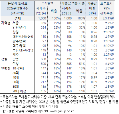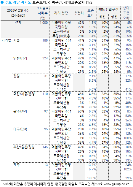¡Ý Áö¿ªÀ̳ª ¿¬·É´ë µî ÀÀ´äÀÚ Æ¯¼ºº° ÁÖ¿ä ÁöÇ¥ ÃßÀÌ´Â → ¿ù°£, → ¿¬°£ ÅëÇÕ ÀÚ·á ±âÁØÀ¸·Î º¸½Ã±æ ±ÇÇÑ´Ù. ¸ÅÁÖ °ø°³ÇÏ´Â Çѱ¹°¶·´ µ¥Àϸ® ¿ÀÇǴϾðÀº À¯È¿Ç¥º» ¾à 1,000¸í Á¶»ç °á°ú·Î, Ç¥º»¿ÀÂ÷´Â ±3%Æ÷ÀÎÆ®(95% ½Å·Ú¼öÁØ)´Ù. Àü±¹ ´ÜÀ§ ÁÖ°£ ÁöÇ¥·Î´Â ¾ÈÁ¤ÀûÀ̶ó ÇÒ ¼ö ÀÖÁö¸¸ Áö¿ªº°, ¿¬·Éº° µî ¼¼ºÎ Ư¼ºº°·Î´Â Ç¥º»¼ö(»ç·Ê¼ö)°¡ ¸¹Áö ¾Ê¾Æ ¸ÅÁÖ ¼öÄ¡¸¦ ´Ü¼øÈ÷ ºñ±³Çؼ± ¾È µÈ´Ù. ¿¹ÄÁ´ë À̹ø ÁÖ Àü±¹ 1,000¸í Á¶»ç¿¡¼ ¼¿ï 185¸í(Á¶»ç¿Ï·á »ç·Ê¼ö) ±âÁØ Ç¥º»¿ÀÂ÷´Â ±7%Æ÷ÀÎÆ®(ÀÌÇÏ 95% ½Å·Ú¼öÁØ)´Ù. ¼¿ïÀÇ ¹ÎÁÖ´ç ÁöÁöµµ 41%´Â °°Àº ¹æ½ÄÀ¸·Î 100¹ø Á¶»çÇßÀ» ¶§ 95¹øÀº ÃÖ¼Ò 34%¿¡¼ ÃÖ´ë 48% ¹üÀ§ ¾È¿¡ µé°í, 5¹ø Á¤µµ´Â ÀÌ ±¸°£À» ¹þ¾î³¯ ¼ö ÀÖÀ½À» ÀǹÌÇÏ´Â ÃßÁ¤Ä¡´Ù.
