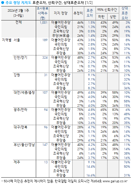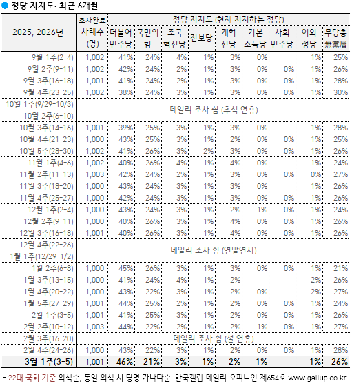 2026³â 3¿ù ù° ÁÖ(3~5ÀÏ) ÇöÀç ÁöÁöÇÏ´Â Á¤´çÀº(´ç¸í ·ÎÅ×À̼Ç, ÀçÁú¹® 1ȸ) ´õºÒ¾î¹ÎÁÖ´ç 46%, ±¹¹ÎÀÇÈû 21%, Á¶±¹Çõ½Å´ç 3%, °³Çõ½Å´ç 2%, Áøº¸´ç, ±âº»¼Òµæ´ç °¢°¢ 1%, ÀÌ¿Ü Á¤´ç/´Üü 1%, ÁöÁöÇÏ´Â Á¤´ç ¾ø´Â ¹«´ç(ÙíÓÚ)Ãþ 26%´Ù. ÀÛ³â 8¿ù Áß¼øºÎÅÍ ¹ÎÁÖ´ç ÁöÁöµµ 40% ³»¿Ü, ±¹¹ÎÀÇÈû 20%´ë ÃÊÁß¹Ý ±¸µµ°¡ Áö¼ÓµÇ´Ù°¡ ÃÖ±Ù ÇÑ ´Þ°£ ¾ç´ç °ÝÂ÷°¡ Ä¿Á³´Ù.