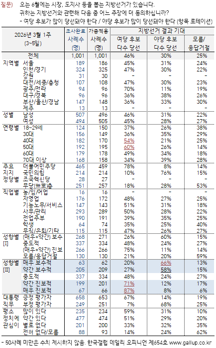2026³â 3¿ù 3~5ÀÏ, Áö¹æ¼±°Å °ü·Ã µÎ °¡Áö ÁÖÀåÀ» Á¦½ÃÇÏ°í ¾î´À ÂÊ¿¡ ´õ µ¿ÀÇÇÏ´ÂÁö ¹°¾ú´Ù(Ç׸ñ ·ÎÅ×À̼Ç). ±× °á°ú '¿©´ç È帰¡ ¸¹ÀÌ ´ç¼±µÅ¾ß ÇÑ´Ù' 46%, '¾ß´ç È帰¡ ¸¹ÀÌ ´ç¼±µÅ¾ß ÇÑ´Ù' 30%·Î ³ªÅ¸³µ´Ù. ¾ç·Ð °ÝÂ÷°¡ ÀÛ³â 10¿ù 3%Æ÷ÀÎÆ®¿¡¼ ¿ÃÇØ 1¿ù 10%Æ÷ÀÎÆ®, À̹ø 3¿ù 16%Æ÷ÀÎÆ®·Î ´õ Ä¿Á³´Ù.