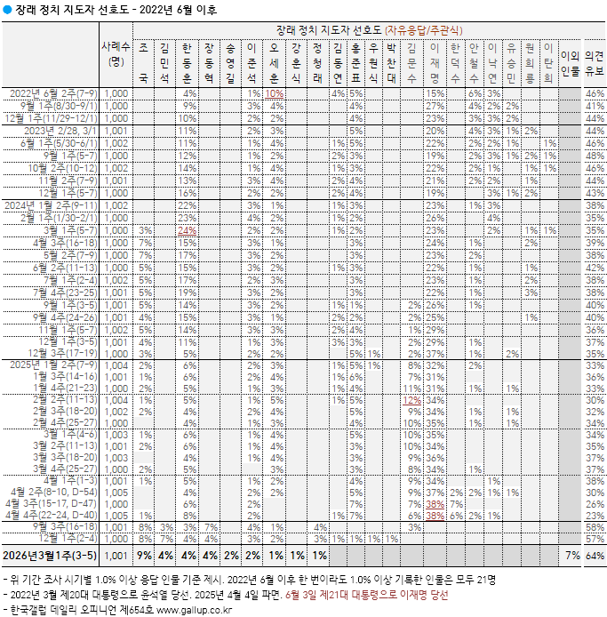 Çѱ¹°¶·´ÀÌ 2026³â 3¿ù 3~5ÀÏ Àü±¹ À¯±ÇÀÚ 1,001¸í¿¡°Ô ¾ÕÀ¸·Î ¿ì¸®³ª¶ó¸¦ À̲ø¾î°¥ Á¤Ä¡ ÁöµµÀÚ, Áï Àå·¡ ´ëÅë·É°¨À¸·Î ´©°¡ ÁÁ´Ù°í »ý°¢ÇÏ´ÂÁö ¹°Àº °á°ú(ÀÚÀ¯ÀÀ´ä), Á¶±¹ Á¶±¹Çõ½Å´ç ´ëÇ¥ 9%, ±è¹Î¼® ±¹¹«ÃѸ®, Çѵ¿ÈÆ Àü ±¹¹ÎÀÇÈû ´ëÇ¥, À嵿Çõ ±¹¹ÎÀÇÈû ´ëÇ¥ °¢°¢ 4%, ¼Û¿µ±æ Àü ´õºÒ¾î¹ÎÁÖ´ç ´ëÇ¥, ÀÌÁؼ® °³Çõ½Å´ç ´ëÇ¥ °¢°¢ 2%, ¿À¼¼ÈÆ ¼¿ï½ÃÀå, °ÈÆ½Ä ´ëÅë·Éºñ¼½ÇÀå, Á¤Ã»·¡ ´õºÒ¾î¹ÎÁÖ´ç ´ëÇ¥ °¢°¢ 1% ¼øÀ¸·Î ³ªÅ¸³µ´Ù. 7%´Â ÀÌ¿Ü Àι°(1.0% ¹Ì¸¸ 20¿© ¸í Æ÷ÇÔ), 64%´Â ƯÁ¤ÀÎÀ» ´äÇÏÁö ¾Ê¾Ò´Ù.