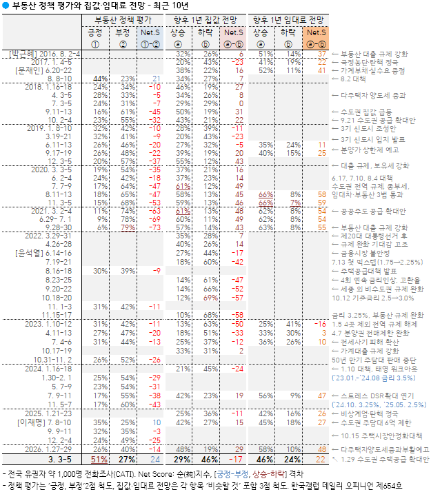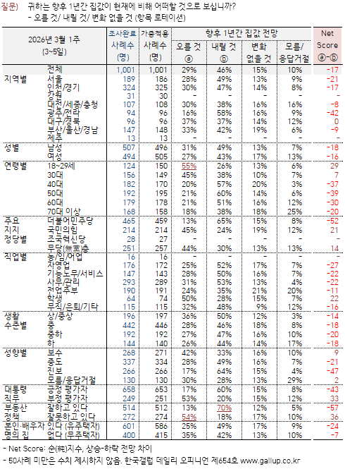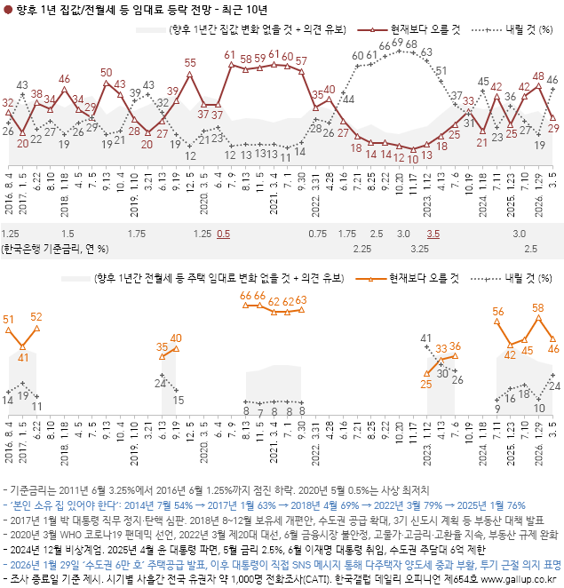 Çѱ¹°¶·´ÀÌ 2026³â 3¿ù 3~5ÀÏ Àü±¹ ¸¸ 18¼¼ ÀÌ»ó 1,001¸í¿¡°Ô ÇâÈÄ 1³â°£ Áý°ª Àü¸ÁÀ» ¹°Àº °á°ú 46%°¡ '³»¸± °Í'À̶ó°í ´äÇß´Ù. '¿À¸¦ °Í' 29%, 'º¯È ¾øÀ» °Í' 15%, ÀÇ°ß À¯º¸ 10%´Ù. 1.29 ¼öµµ±Ç ÁÖÅðø±Þ ¹æ¾È ¹ßÇ¥ Á÷Àü±îÁö Áý°ª »ó½Â·Ð ¿ìÀ§¿´À¸³ª, ÇÑ ´Þ¿© ¸¸¿¡ Ç϶ô·Ð ¿ìÀ§·Î ¹Ù²î¾ú´Ù.