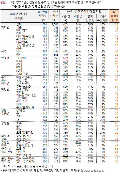 ÇâÈÄ 1³â°£ Àü¿ù¼¼ µî ÁÖÅà ÀÓ´ë·á¿¡ ´ëÇØ¼´Â 46%°¡ '¿À¸¦ °Í'À̶ó°í Àü¸ÁÇß°í 24%´Â '³»¸± °Í', 20%´Â 'º¯È ¾øÀ» °Í'À̶ó°í ºÃ´Ù. 10%´Â ÀǰßÀ» À¯º¸Çß´Ù. Áý°ª°ú ´Þ¸® ÀÓ´ë·á Àü¸Á¿¡¼´Â ¿©ÀüÈ÷ »ó½Â·ÐÀÌ ¿ìÀ§¿¡ ÀÖ´Ù. ÀÌ´Â Áö¿ª °£ ¼ö¿ä·°ø±Þ ºÒ±ÕÇü, ¹ÝÀü¼¼·¿ù¼¼ °¡¼ÓÈ µî ¿µÇâÀ¸·Î º¸ÀδÙ.