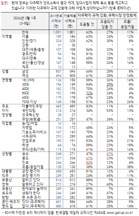 ÇöÀç Á¤ºÎ´Â ´ÙÁÖÅÃÀÚ ¾çµµ¼Òµæ¼¼ Áß°ú Àç°³, ÀÓ´ë»ç¾÷ÀÚ ÇìÅà Ãà¼Ò µîÀ» ¿¹°íÇϰí ÀÖ´Ù. ÀÌ·¯ÇÑ ´ÙÁÖÅÃÀÚ ±ÔÁ¦ °È¿¡ °üÇØ¼´Â À¯±ÇÀÚÀÇ 62%°¡ 'ÁÖÅýÃÀå ¾ÈÁ¤È¿¡ µµ¿òµÉ °Í', 27%°¡ 'µµ¿òµÇÁö ¾ÊÀ» °Í'À̶ó°í ºÃ´Ù. 11%´Â ÀǰßÀ» À¯º¸Çß´Ù. ´ëºÎºÐ ÀÀ´äÀÚ Æ¯¼º¿¡¼ ´ÙÁÖÅÃÀÚ ±ÔÁ¦ °È¿¡ µ¿Á¶Çß´Ù. ¾ÈÁ¤È ±â¿©·ÐÀÚ ºñÀ²À» ¼ºÇ⺰·Î º¸¸é Áøº¸Ãþ 84%, ÁßµµÃþ 67%, º¸¼öÃþ¿¡¼µµ 47%¸¦ Â÷ÁöÇÑ´Ù. ´ÙÁÖÅÃÀÚ¸¦ ¾Ð¹ÚÇϸé Àü¿ù¼¼¿Í ¼¹Î ÁְŰ¡ ´õ ºÒ¾ÈÇØÁø´Ù´Â ÁÖÀåµµ ÀÖÀ¸³ª, Çö½ÃÁ¡ ¿©·ÐÀº ´ëÅë·É°ú Á¤ºÎ ¹æÄ§¿¡ ´õ È£ÀÀÇÑ´Ù°í º¼ ¼ö ÀÖ°Ú´Ù.