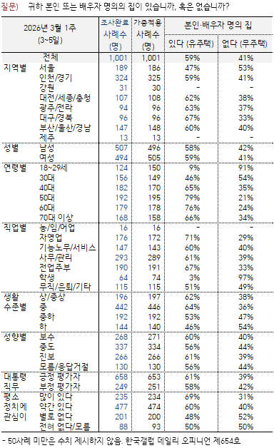 ¡Ý À¯±ÇÀÚ Àý´ë´Ù¼ö´Â 1ÁÖÅÃÀÚ³ª ¹«ÁÖÅÃÀÚ´Ù. À̹ø Á¶»ç¿¡¼ º»ÀÎ ¶Ç´Â ¹è¿ìÀÚ ¸íÀÇÀÇ ÁýÀÌ ÀÖ´Â »ç¶÷(À¯ÁÖÅÃÀÚ)Àº 59%, ¿¬·Éº°·Î´Â 20´ë 9%, 30´ë 46%, 40´ë 65%, 50´ë 79%, 60´ë 76%, 70´ë ÀÌ»ó 66%´Ù. °ú°Å ¿©·¯ Á¶»ç¿¡¼ º»ÀÎ/¹è¿ìÀÚ ¸íÀÇ 2ä ÀÌ»ó ÁÖÅà º¸À¯ÀÚ´Â ¿¿¡ ÇÑ ¸í Á¤µµ¿´´Ù(→ Á¦466È£).