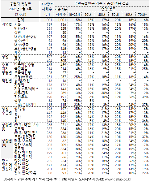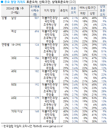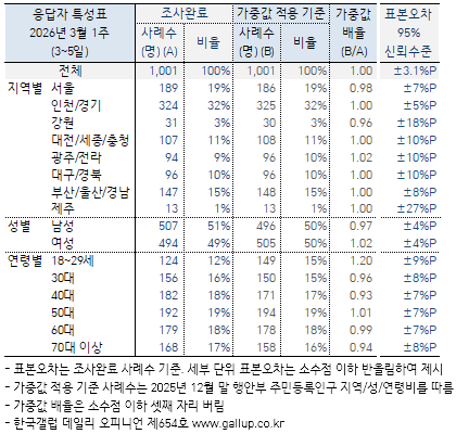 ¡Ý Áö¿ªÀ̳ª ¿¬·É´ë µî ÀÀ´äÀÚ Æ¯¼ºº° ÁÖ¿ä ÁöÇ¥ ÃßÀÌ´Â → ¿ù°£, → ¿¬°£ ÅëÇÕ ÀÚ·á ±âÁØÀ¸·Î º¸½Ã±æ ±ÇÇÑ´Ù. ¸ÅÁÖ °ø°³ÇÏ´Â Çѱ¹°¶·´ µ¥Àϸ® ¿ÀÇǴϾðÀº À¯È¿Ç¥º» ¾à 1,000¸í Á¶»ç °á°ú·Î, Ç¥º»¿ÀÂ÷´Â ±3%Æ÷ÀÎÆ®(95% ½Å·Ú¼öÁØ)´Ù. Àü±¹ ´ÜÀ§ ÁÖ°£ ÁöÇ¥·Î´Â ¾ÈÁ¤ÀûÀ̶ó ÇÒ ¼ö ÀÖÁö¸¸ Áö¿ªº°, ¿¬·Éº° µî ¼¼ºÎ Ư¼ºº°·Î´Â Ç¥º»¼ö(»ç·Ê¼ö)°¡ ¸¹Áö ¾Ê¾Æ ¸ÅÁÖ ¼öÄ¡¸¦ ´Ü¼øÈ÷ ºñ±³Çؼ± ¾È µÈ´Ù. ¿¹ÄÁ´ë À̹ø ÁÖ Àü±¹ 1,001¸í Á¶»ç¿¡¼ ´ëÀü/¼¼Á¾/ÃæÃ» 107¸í(Á¶»ç¿Ï·á »ç·Ê¼ö) ±âÁØ Ç¥º»¿ÀÂ÷´Â ±10%Æ÷ÀÎÆ®(ÀÌÇÏ 95% ½Å·Ú¼öÁØ)´Ù. ´ëÀü/¼¼Á¾/ÃæÃ»ÀÇ ¹ÎÁÖ´ç ÁöÁöµµ 49%´Â °°Àº ¹æ½ÄÀ¸·Î 100¹ø Á¶»çÇßÀ» ¶§ 95¹øÀº ÃÖ¼Ò 39%¿¡¼ ÃÖ´ë 59% ¹üÀ§ ¾È¿¡ µé°í, 5¹ø Á¤µµ´Â ÀÌ ±¸°£À» ¹þ¾î³¯ ¼ö ÀÖÀ½À» ÀǹÌÇÏ´Â ÃßÁ¤Ä¡´Ù.