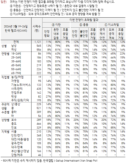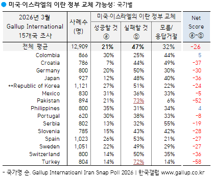 | ¡Ü 1947³â Á¶Áö °¶·´ ¹Ú»ç°¡ ¼³¸³ÇÑ °¶·´ ÀÎÅͳ»¼Å³Î(Gallup International Association)Àº 1977³âºÎÅÍ Àü ¼¼°è ȸ¿ø»çµéÀÌ ¸Å³â ¸» ÀÚ±¹¹ÎÀ» ´ë»óÀ¸·Î °æÁ¦, ³ëµ¿, ±¹Á¦ °ü°è µî Çö¾È¿¡ ´ëÇÑ Àνİú »õÇØ Àü¸ÁÀ» ¾Ë¾Æº¸´Â ¡´End of Year Survey¡µ¸¦ ÇØ¿Ô½À´Ï´Ù. Çѱ¹°¶·´Àº 1979³âºÎÅÍ Âü¿©Çϰí ÀÖ½À´Ï´Ù. → Press release for the 120th Anniversary of Dr. George Gallup ¡Ü ÇöÀç ¹Ì±¹°ú À̽º¶ó¿¤ÀÌ À̶õÀ» »ó´ë·Î ÀüÀï ÁßÀä. °¶·´ ÀÎÅͳ»¼Å³ÎÀÌ 2026³â 3¿ù Çѱ¹À» Æ÷ÇÔÇÑ 15°³±¹ ½Ã¹Î¿¡°Ô À̹ø ÀüÀïÀ» ¾î¶»°Ô º¸´ÂÁö ¹°¾ú½À´Ï´Ù. |