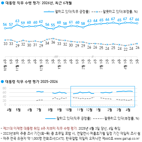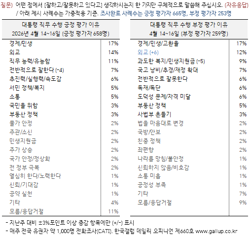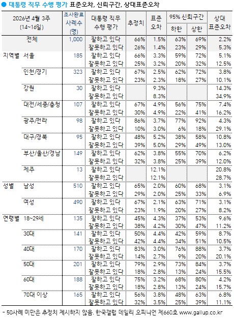 Çѱ¹°¶·´ÀÌ 2026³â 4¿ù ¼Â° ÁÖ(14~16ÀÏ) Àü±¹ ¸¸ 18¼¼ ÀÌ»ó À¯±ÇÀÚ 1,000¸í¿¡°Ô ÀÌÀç¸í ´ëÅë·ÉÀÌ ÇöÀç ´ëÅë·ÉÀ¸·Î¼ÀÇ Á÷¹«¸¦ Àß ¼öÇàÇϰí ÀÖ´Ù°í º¸´ÂÁö À߸ø ¼öÇàÇϰí ÀÖ´Ù°í º¸´ÂÁö ¹°Àº °á°ú(2Á¡ ôµµ, ÀçÁú¹® 1ȸ), 66%°¡ ±àÁ¤ Æò°¡Çß°í 26%´Â ºÎÁ¤ Æò°¡Çß´Ù. 8%´Â ÀǰßÀ» À¯º¸Çß´Ù.