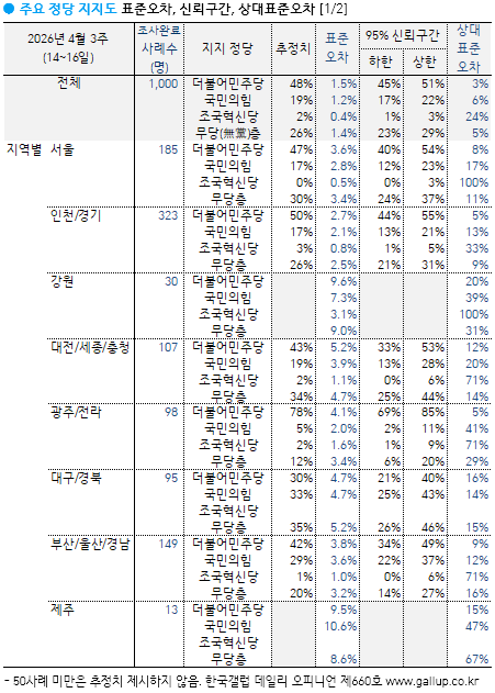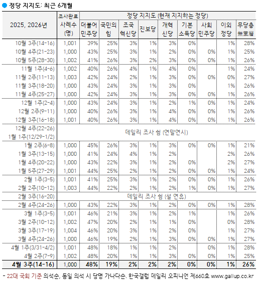 2026³â 4¿ù ¼Â° ÁÖ(14~16ÀÏ) ÇöÀç ÁöÁöÇÏ´Â Á¤´çÀº(´ç¸í ·ÎÅ×À̼Ç, ÀçÁú¹® 1ȸ) ´õºÒ¾î¹ÎÁÖ´ç 48%, ±¹¹ÎÀÇÈû 19%, Á¶±¹Çõ½Å´ç, Áøº¸´ç, °³Çõ½Å´ç °¢°¢ 2%, ÀÌ¿Ü Á¤´ç/´Üü 1%, ÁöÁöÇÏ´Â Á¤´ç ¾ø´Â ¹«´ç(ÙíÓÚ)Ãþ 26%´Ù. ¹ÎÁÖ´çÀº 3ÁÖ° Çö Á¤ºÎ Ãâ¹ü ÈÄ ÁöÁöµµ ÃÖ°íÄ¡¸¦ À¯ÁöÇß´Ù. °°Àº ±â°£ ±¹¹ÎÀÇÈûÀº 2¿ù ÃÊ 25%¿¡¼ 4¿ù ÃÊ 18%(Çö Á¤ºÎ Ãâ¹ü ÈÄ ÃÖÀúÄ¡)±îÁö Ç϶ôÇÏ´Â µî Çö Á¤ºÎ Ãâ¹ü ÈÄ °¡Àå ³·Àº ¼öÁØ¿¡ ¸Ó¹®´Ù. ÀÛ³â 8¿ù Áß¼øºÎÅÍ ¿ÃÇØ 1¿ù±îÁö´Â ¹ÎÁÖ´ç ÁöÁöµµ 40% ³»¿Ü, ±¹¹ÎÀÇÈû 20%´ë ÃÊÁß¹Ý ±¸µµ¿´´Ù.