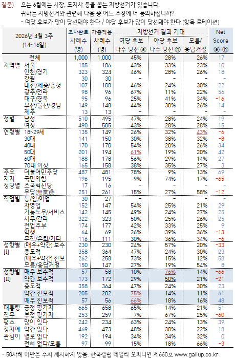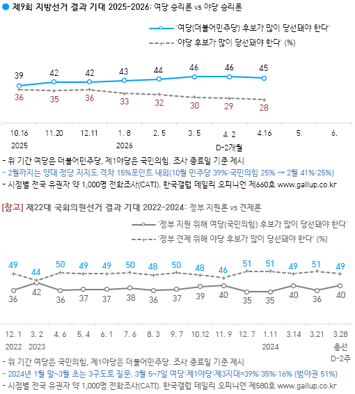 2026³â 4¿ù 14~16ÀÏ Áö¹æ¼±°Å °ü·Ã µÎ °¡Áö ÁÖÀåÀ» Á¦½ÃÇÏ°í ¾î´À ÂÊ¿¡ ´õ µ¿ÀÇÇÏ´ÂÁö ¹°¾ú´Ù(Ç׸ñ ·ÎÅ×À̼Ç). ±× °á°ú '¿©´ç È帰¡ ¸¹ÀÌ ´ç¼±µÅ¾ß ÇÑ´Ù' 45%, '¾ß´ç È帰¡ ¸¹ÀÌ ´ç¼±µÅ¾ß ÇÑ´Ù' 28%·Î ³ªÅ¸³µ´Ù. ¾ç·Ð °ÝÂ÷´Â 2ÁÖ Àü°ú ´Ù¸§¾øÀ¸¸ç, ÀÛ³â 10¿ù 3%Æ÷ÀÎÆ®¿¡¼ ¿ÃÇØ 1¿ù 10%Æ÷ÀÎÆ®, 4¿ù 17%Æ÷ÀÎÆ®·Î Ä¿Á³´Ù.