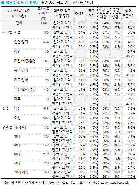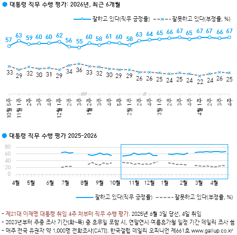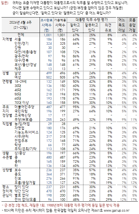 Çѱ¹°¶·´ÀÌ 2026³â 4¿ù ³Ý° ÁÖ(21~23ÀÏ) Àü±¹ ¸¸ 18¼¼ ÀÌ»ó À¯±ÇÀÚ 1,001¸í¿¡°Ô ÀÌÀç¸í ´ëÅë·ÉÀÌ ÇöÀç ´ëÅë·ÉÀ¸·Î¼ÀÇ Á÷¹«¸¦ Àß ¼öÇàÇϰí ÀÖ´Ù°í º¸´ÂÁö À߸ø ¼öÇàÇϰí ÀÖ´Ù°í º¸´ÂÁö ¹°Àº °á°ú(2Á¡ ôµµ, ÀçÁú¹® 1ȸ), 67%°¡ ±àÁ¤ Æò°¡Çß°í 25%´Â ºÎÁ¤ Æò°¡Çß´Ù. 8%´Â ÀǰßÀ» À¯º¸Çß´Ù.